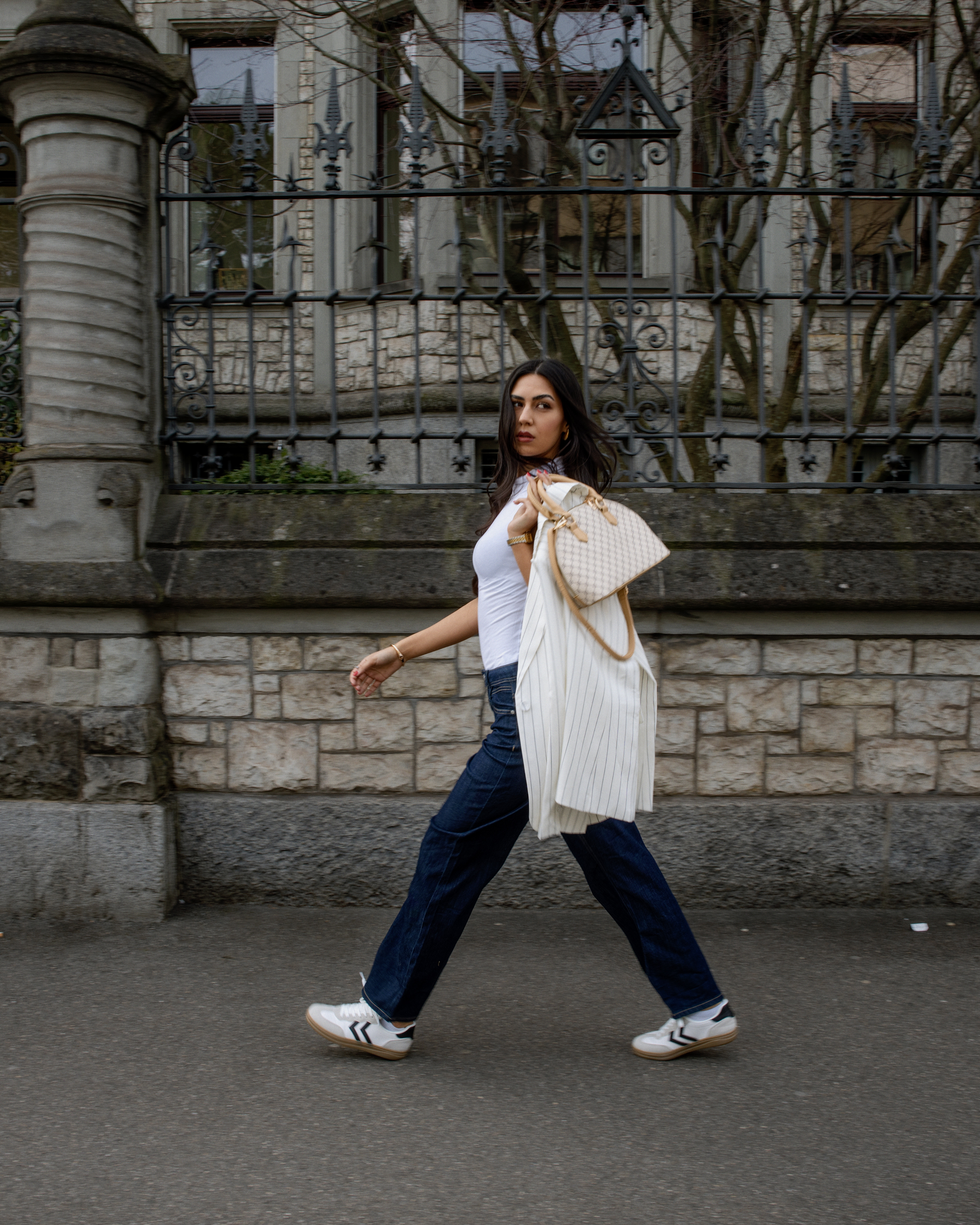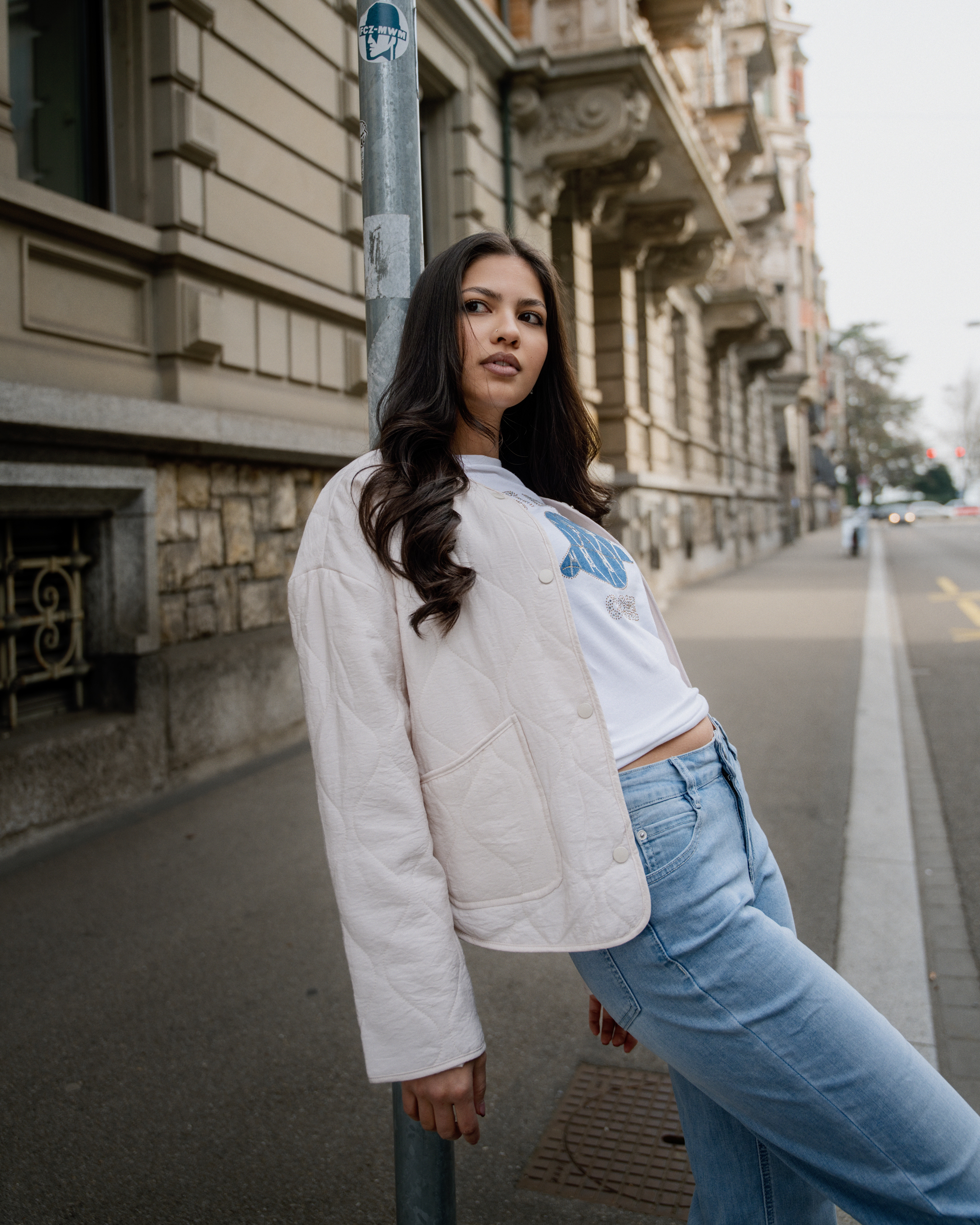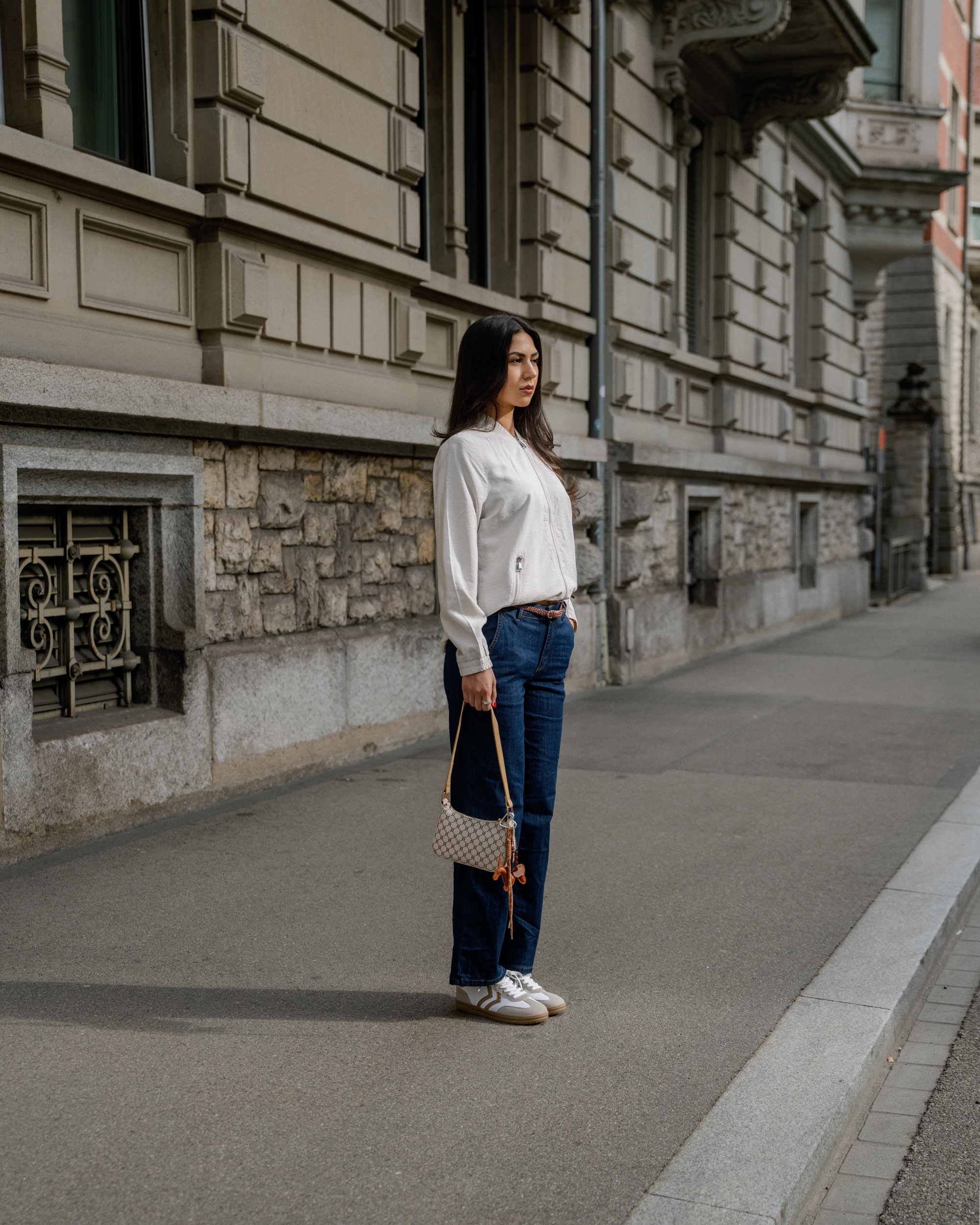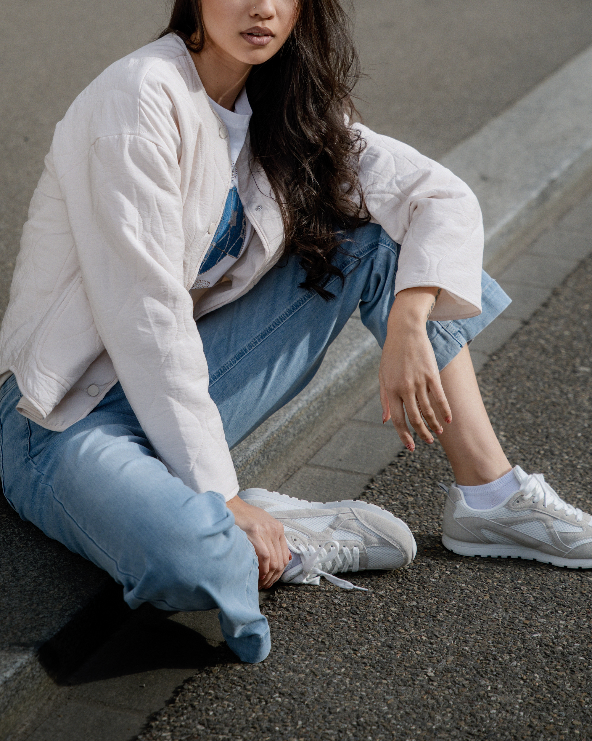 Jeans relaxed, vestes légères et blazers stylés se mêlent à des couleurs claires et à des tons denim doux. Des sneakers et de petits sacs complètent le look pour un style street moderne et décontracté.